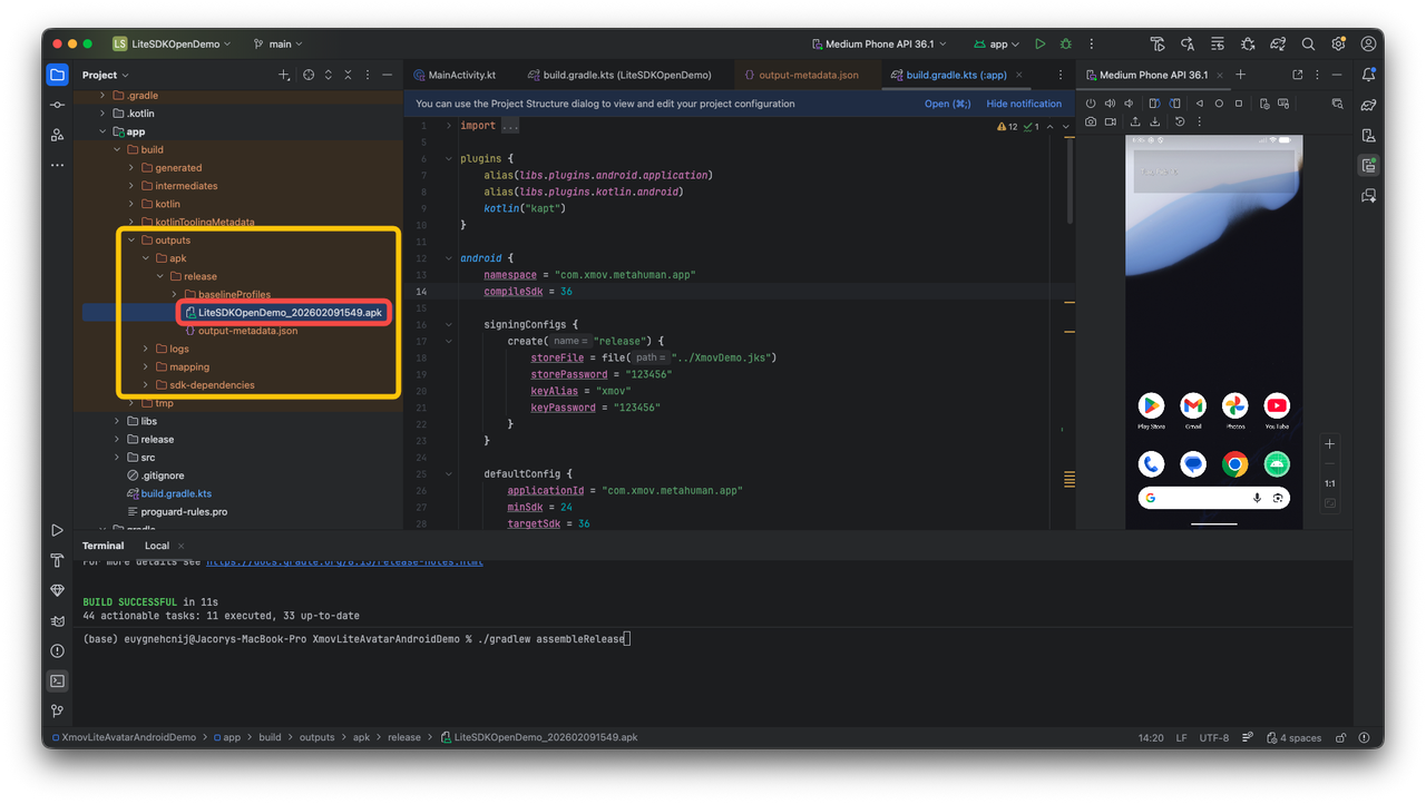 构建命令执行成功后,终端会显示 "BUILD SUCCESSFUL"。此时生成的发布包位于项目的 build 目录下。